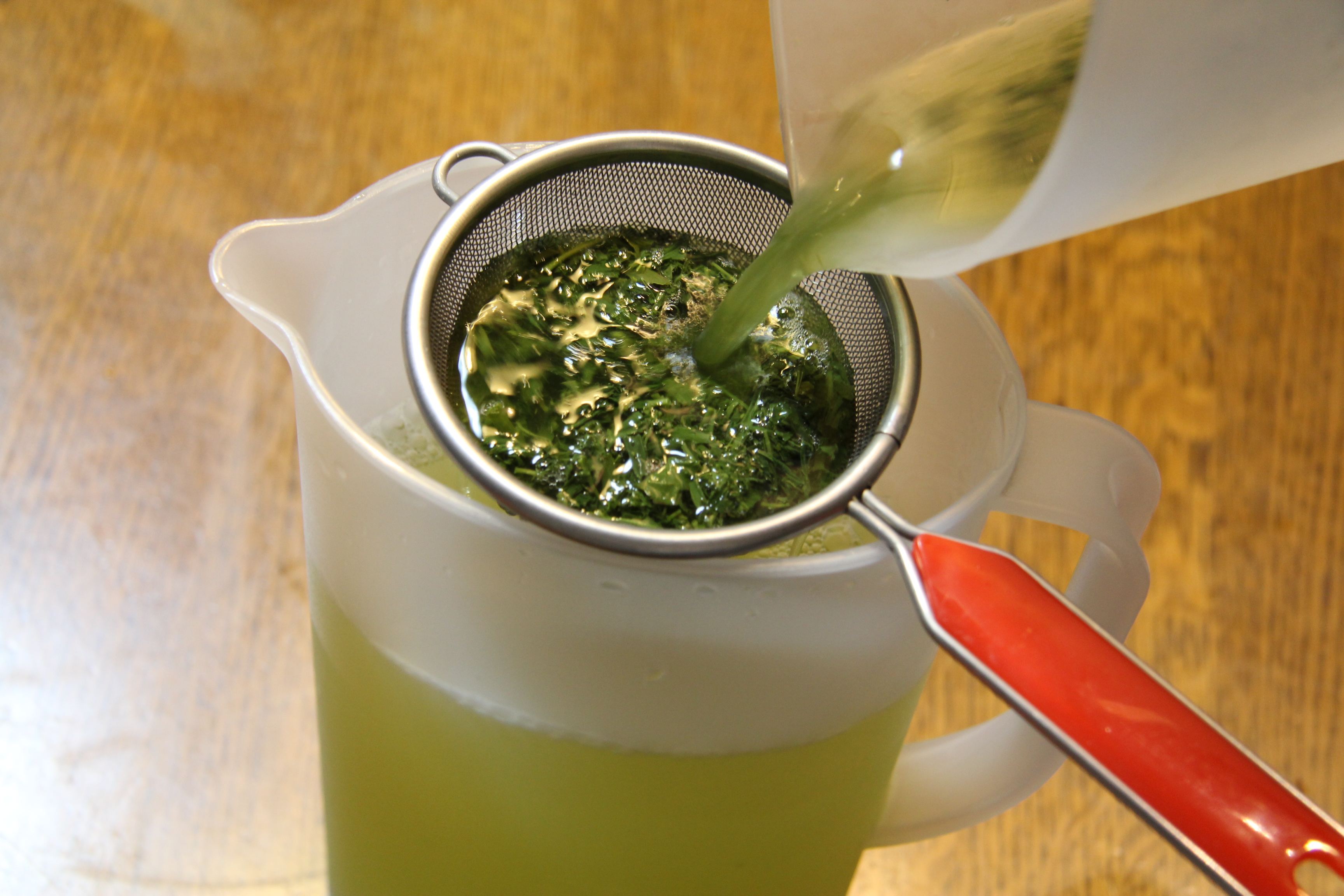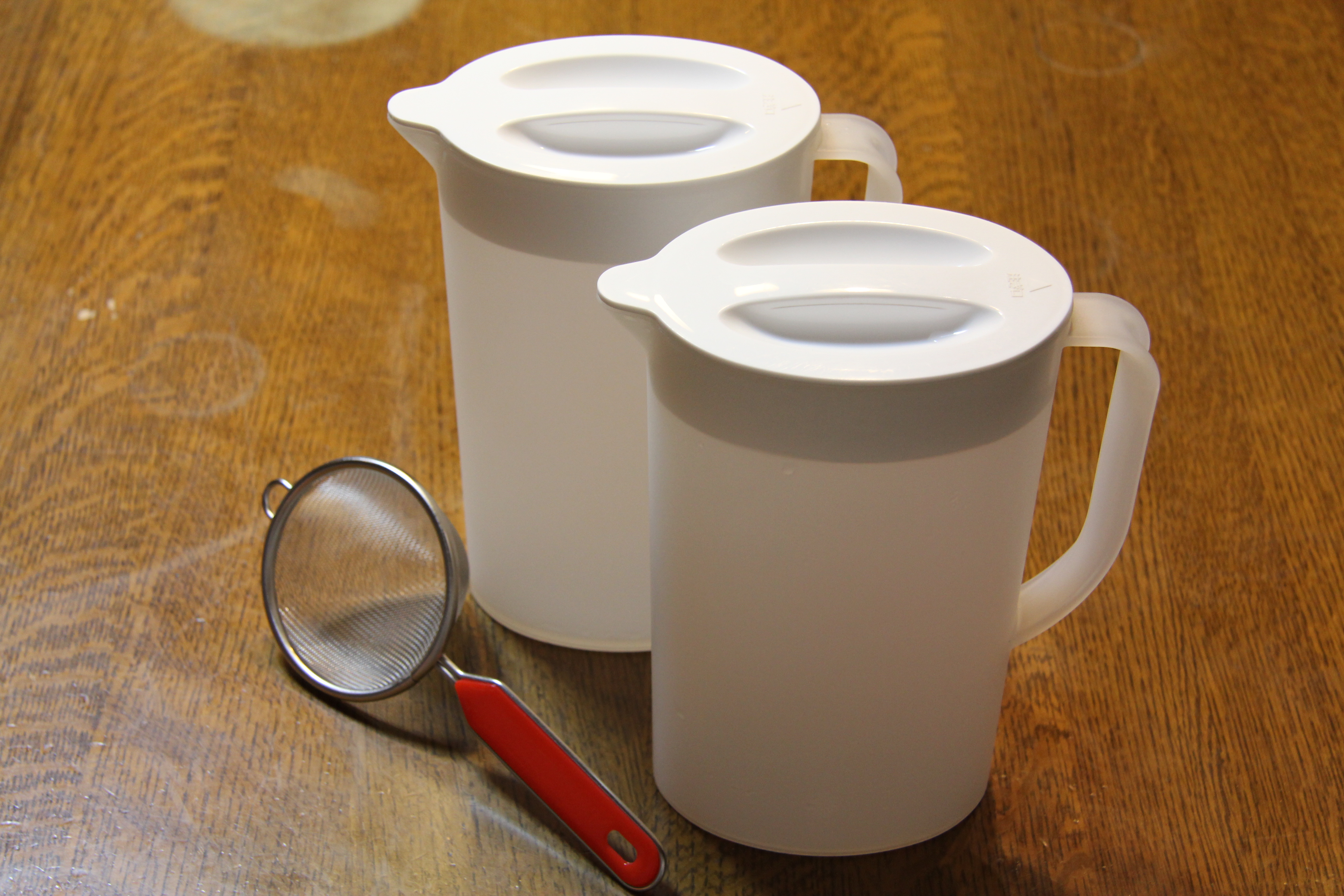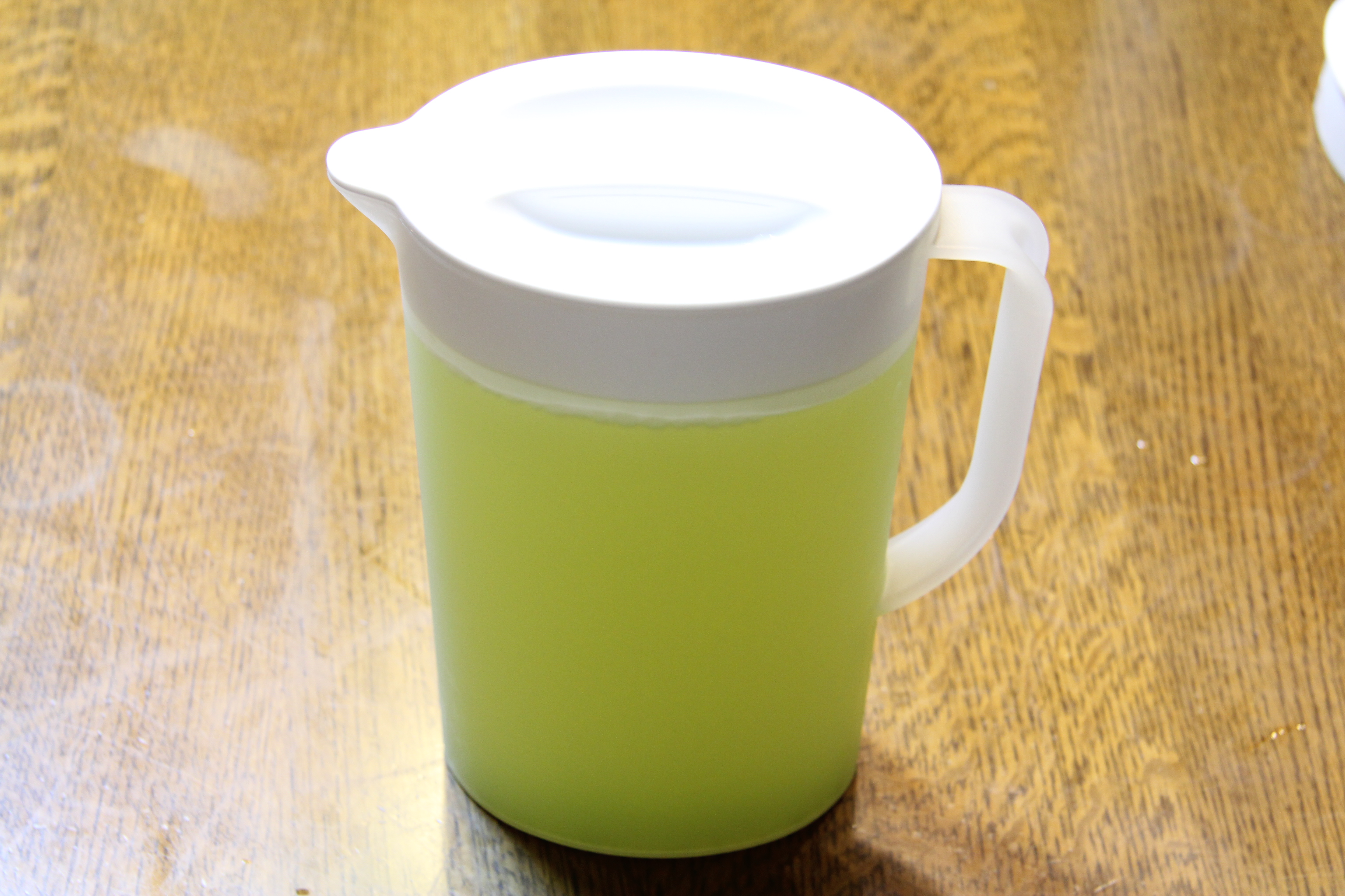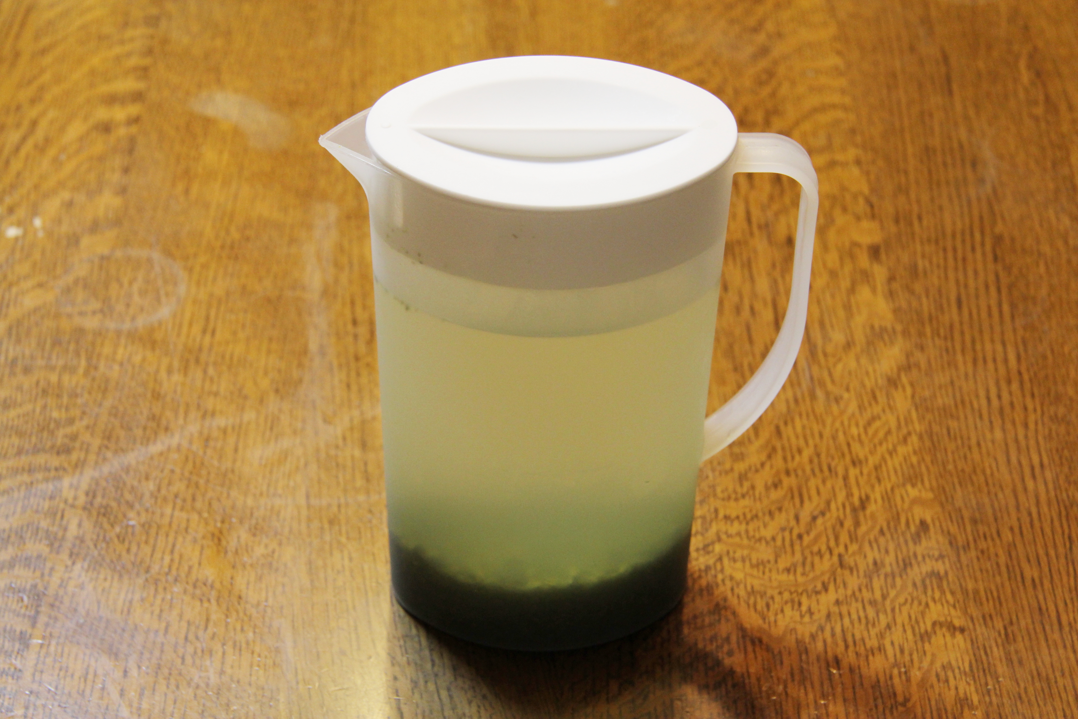 1.麦茶ポットと茶こしアミ、煎茶と水を用意